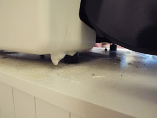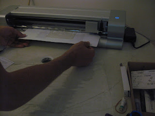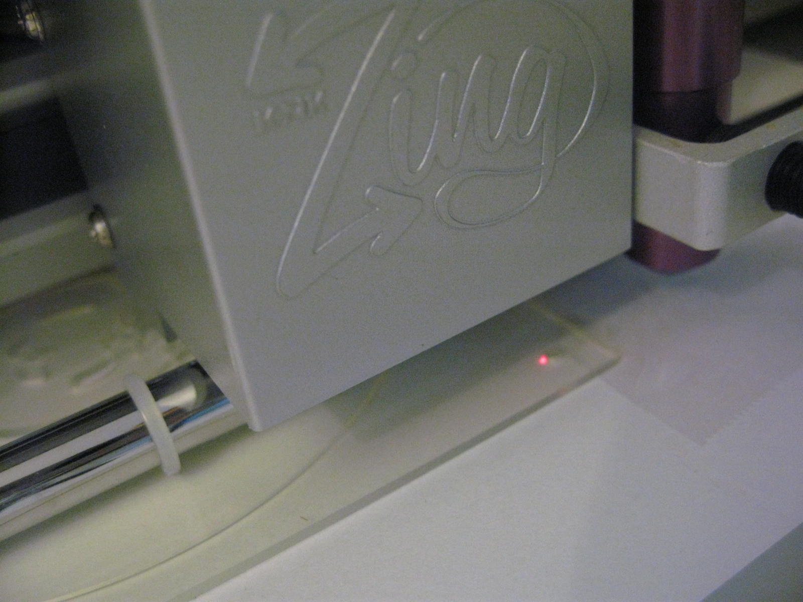 Now the machine initializes and feeds PVC onto the build table, but it intermittently fails to trim the material. To trim the PVC, the machine is supposed to raise the build table until the white cutting board (green arrow) makes contact with the trimming knife. But the Y-axis position is still wrong, so it's positioning the trim knife too far away from the table (red arrow). I used the maintenance utility to re-calibrate "accurate XY home" but then the machine was even farther out of calibration!