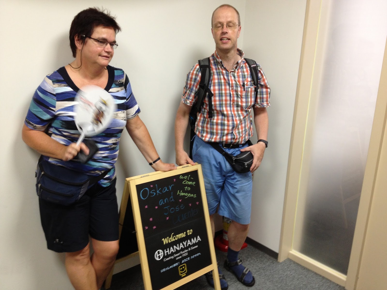 Hanayama, the maker of the world's finest mass-produced brainteaser puzzles. Above, Oskar van Deventer and his wife discovered a sign that greeted his arrival outside the Hanayama office.
