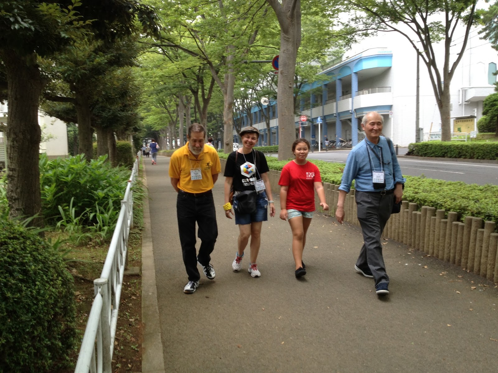 International Puzzle Party many other puzzlers had already been there for quite some time, and they'd been out sightseeing and visiting. I joined a small group of friends on an unofficial trip to visit a few puzzle sights, including (pictured above) George Miller, Roxanne Wong (wearing my ivy cap) and her daughter Katherine, and Naoki Takashima.